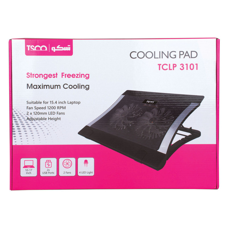 ابعاد: 360x270x23 میلیمتر مناسب برای سیستم های گیم و فنی ارتفاع قابل تنظیم دارای چراغ LED دارای فناوری فن بی صدا سرعت چرخش فن RPM 2500 دارای 2 پورت USB