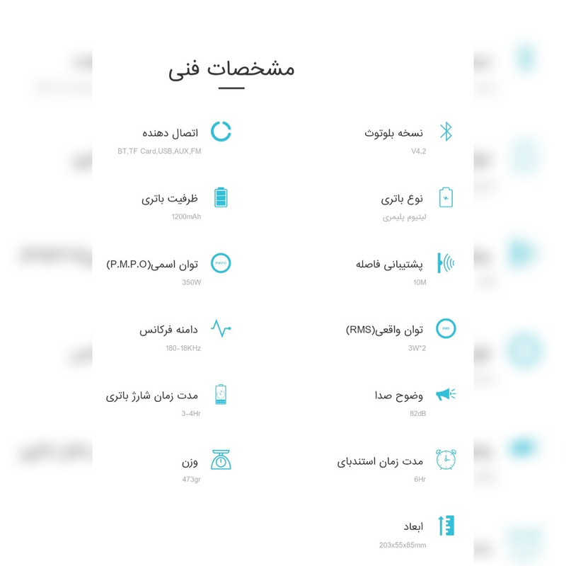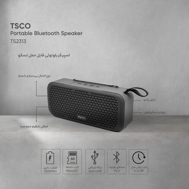 اسپیکر بلوتوث تسکو TS 2313 در ابعاد 203x55x85 میلیمتر و نوع اتصال بیسیم ساخته شده است. اتصال دهنده های این اسپیکر بلوتوث با نسخه 4.2 ، شیار کارت حافظه و USB بوده و از یک باتری لیتیومی با ظرفیت 1200 میلیآمپر ساعت بهره میگیرد. کیفیت پخش صدا این اسپیکر بلوتوث TS 2313 ، استریو و فرکانس پاسخگویی آن 18 تا 180 هزار هرتز است و از این جهت برای استفاده در مهمانی و دورهمی های دوستانه مناسب است. اسپیکر بلوتوث تسکو-TSCO مدل TS 2313 از میکروفون داخلی بهره میگیرد، که قابلیت برقراری تماس را به این محصول افزوده است. دکمه های تعبیه شده بر روی این محصول مدیریت دستگاه و پاسخ به تماس های دریافتی را آسان تر میکند.