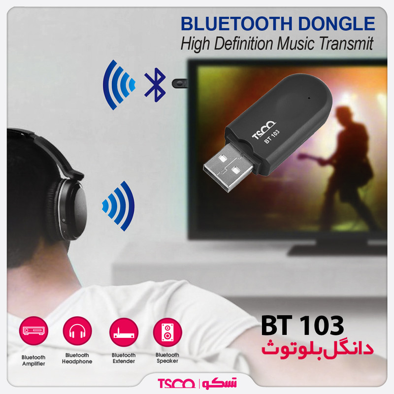 دانگل بلوتوث مدل BT 103 محصولی از برند تسکو است که قابلیت اتصال به هدست و اسپیکر بلوتوث را داراست و مناسب برای انتقال صدای TV به تمامی اسپیکرها و هدست های دارای بلوتوث می باشد .دانگل بلوتوث BT 103 نیازی به نصب نرم افزار و راه اندازی ندارد و به صورت پرتابل قابل استفاده است و برای روشن شدن دستگاه کافیست پورت USB را به منبع تغذیه (آداپتور -5v) متصل کنید ، سپس کابل AUX یا صدا را به دستگاه BT 103 و همچنین به خروجی دستگاه فرستنده مانند ( TV, .......) وصل کنید. سپس بلوتوث دستگاه ( مانند اسپیکر ، هدفون و .....) در حالت روشن نگه دارید تا به صورت خودکار به آن متصل گردد.