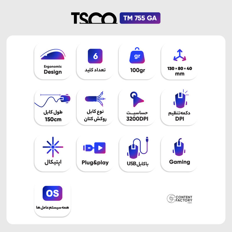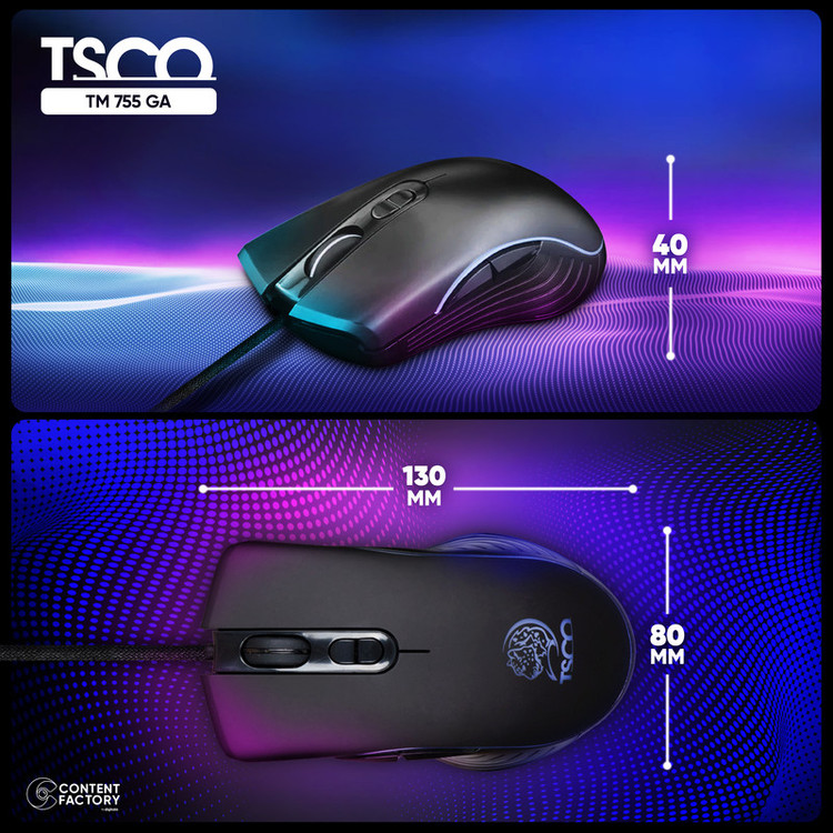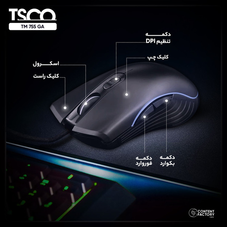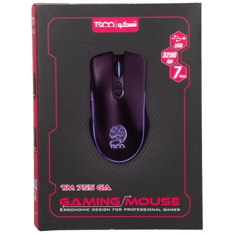 ماوس مخصوص بازی تسکو مدل TM 755 GA، از بهترین برندهای ایرانی است که در سال ۱۳۸۱ تاسیس و اقدام به تولید تجهیزات کامپیوتری از جمله ماوسهای پرکاربرد و باکیفیت کرد. این ماوس از نوع نوری بوده و هنگام کار با آن، لامپهای LED با نور بسیار جذاب و زیبا روشن خواهند شد. این محصول وزنی کمتر از ۱۴۰ گرم داشته و دارای ۷ کلید کاربردی است. همچنین حسگر این محصول، از نوع اپتیکال بوده که کاربران به راحتی میتوانند در سطوح مختلف از آن استفاده کنند. ماوس مخصوص بازی تسکو مدل TM 755 GA، بهصورت باسیم به لپتاپ یا رایانه متصل شده و باعث میشود که راحتتر بتوانید با دستگاه کار کنید. کابل دستگاه طولی حدود ۱.۸ متر داشته و به پورت USB وصل خواهد شد. از ویژگیهای بسیار خوب این دستگاه، روکش کنفی کابل است که باعث مقاومت بیشتر ماوس و کار کردن راحتتر با آن میشود. این ماوس پرکاربرد، دقت بسیار بالایی در محدوده ۱۲۰۰ تا ۳۲۰۰dpi داشته و برای انجام انواع گیم و بازی رایانهای بسیار مناسب است.